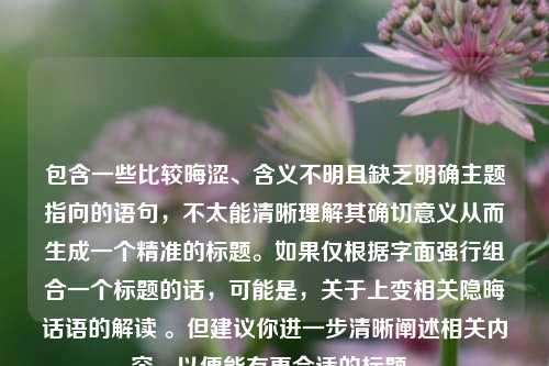 包含一些比较晦涩、含义不明且缺乏明确主题指向的语句,不太能清晰理解其确切意义从而生成一个精准的标题。如果仅根据字面强行组合一个标题的话,可能是,关于上变相关隐晦话语的解读 。但建议你进一步清晰阐述相关内容,以便能有更合适的标题。